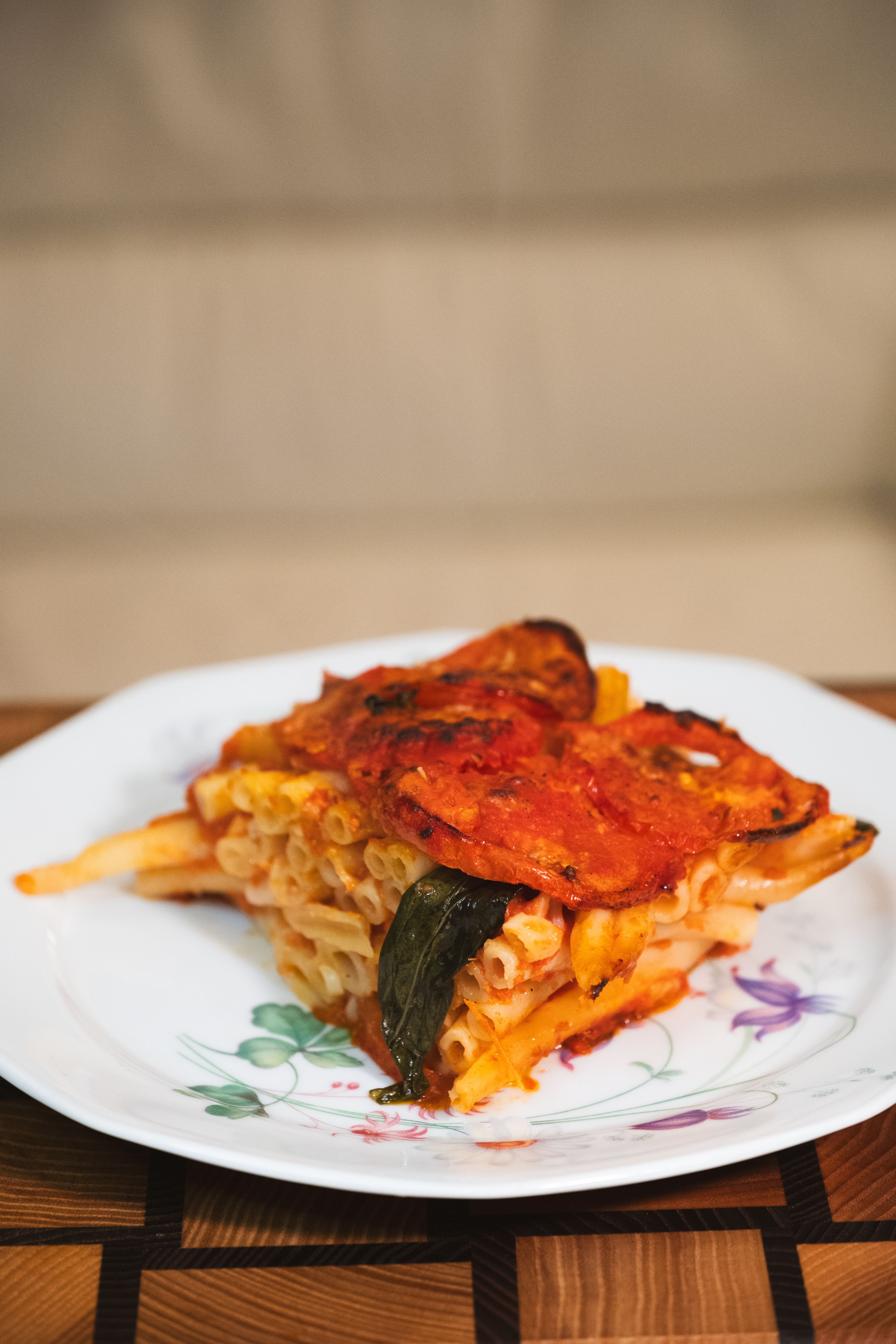 - Componi il secondo stratoRipeti la stratificazione: pasta condita, fette di pomodoro a chiudere in superficie, abbondante pecorino grattugiato e basilico fresco.